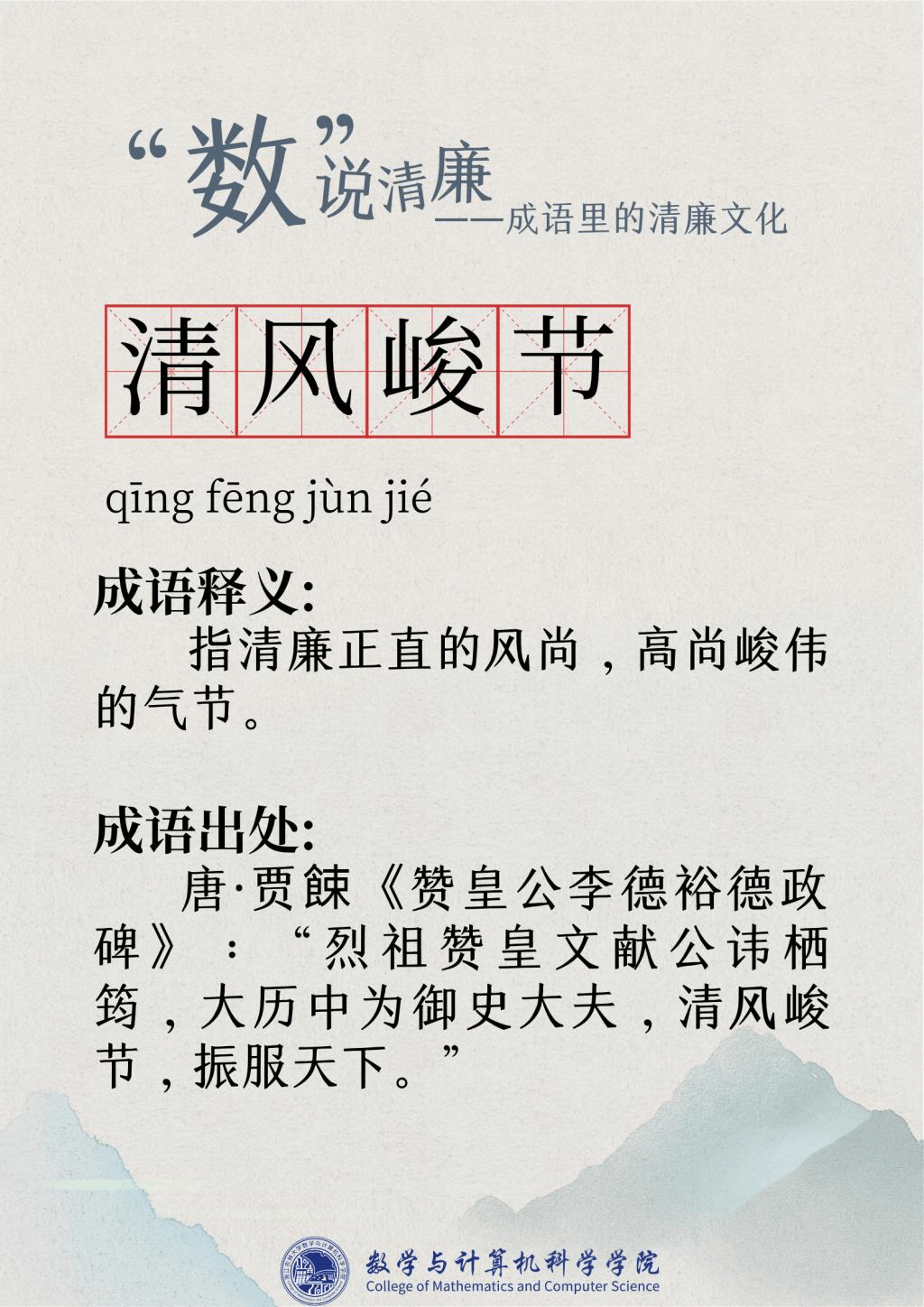 “廉洁”一词最早出现在屈原的作品“宁廉洁正直以自清”中。为人清廉正直从古至今都被视作立身处世最重要的品质之一。习近平总书记曾强调要“加强新时代廉洁文化建设涵养求真务实,团结奋斗的时代新风”。为深入挖掘中华传统文化中数字与成语诗词结合的廉洁要素,展现“廉洁”在中国传统文化瑰宝中浓墨重彩的独特地位,充分发挥清廉文化浸润校园、春风化雨的积极作用,伟德国际victor1946现推出“数”说清廉——成语里的清廉文化系列文章,以传统文化之土壤培育清廉之花。