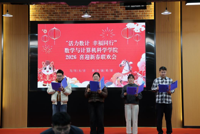 联欢会在悠扬的古琴独奏声中拉开帷幕。随后,数学学科、计算机学科及5个专业、院办、学生办、实验中心、退休老师代表等各种组合依次上场,深情演绎《我和我的祖国》《我的祖国》《你最珍贵》《当》《FM1011新年版:共此时》等合唱、独唱曲目,引得大家一片掌声。期间,智科专业老师呈上的魔术表演引得现场惊叹连连;大数据专业老师的舞蹈《世界赠与我的》,轻盈舞姿赢得阵阵喝彩;计算机专业老师的诗朗诵《未选择的路》,则让大家深切感受到新时代青年老师对选择与奋斗的哲思。